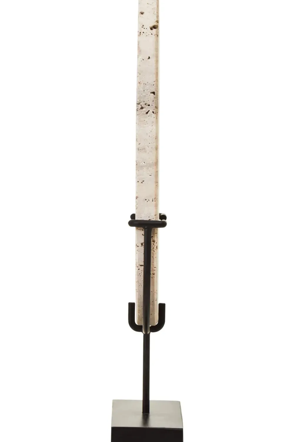 - Material: Natural Travertine Stone Sculpture / Acacia Wood Base / Iron Stem