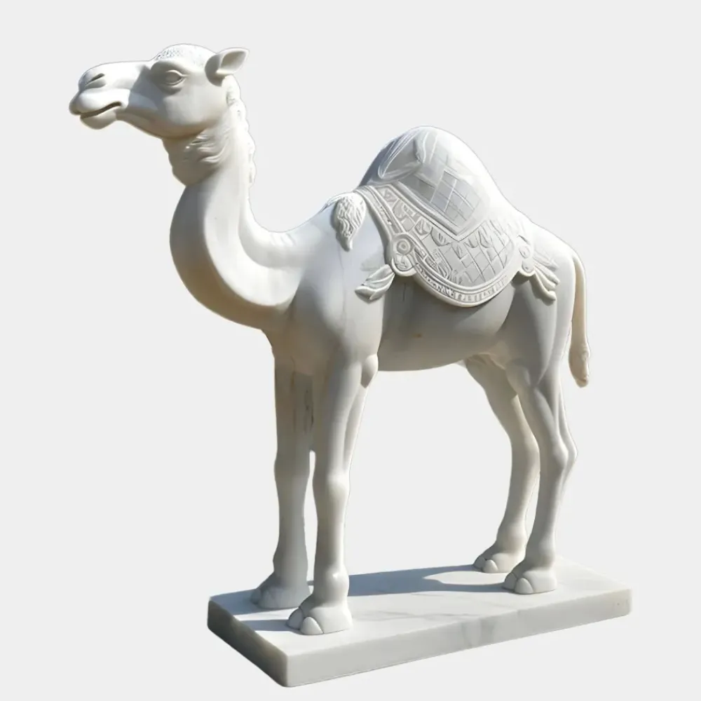 This exquisite Desert Camel Statue is a true celebration of fine craftsmanship meticulously carved from high-grade white marble. Its lifelike design captures the camel’s serene and dignified presence offering a captivating visual appeal in any setting. The polished smooth surface enhances the clean lines of the silhouette while intricate detailing – from the camel’s gentle expression to the natural folds in its posture adds depth and realism. The finely carved saddle adorned with traditional patterns brings cultural significance and artistic sophistication to the piece.