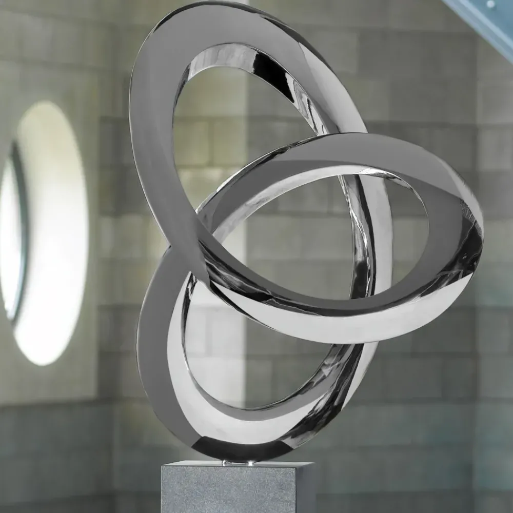 Overview: Outstanding in style this Helix contemporary sculpture is perfect as a centrepiece in the modern home. This sculpture is finished in wonderfully sleek polished stainless steel with a black granite base. Irregular structure, colour and shape, cut surfaces not rectangular! Exclusive contemporary art – when viewed closely you will see the marks of handcraft and individualities of every piece.