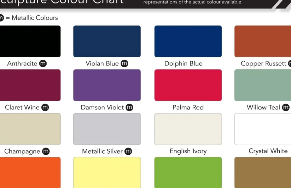 - Sculpture Colours (Gloss Finish): Anthracite, Violan Blue, Dolphin Blue, Copper Russett, Claret Wine, Damson Violet, Palma Red, Willow Teal, Champagne, Silver, English Ivory, Crystal White, Orange Pur, Daffodil Yellow & Braemar