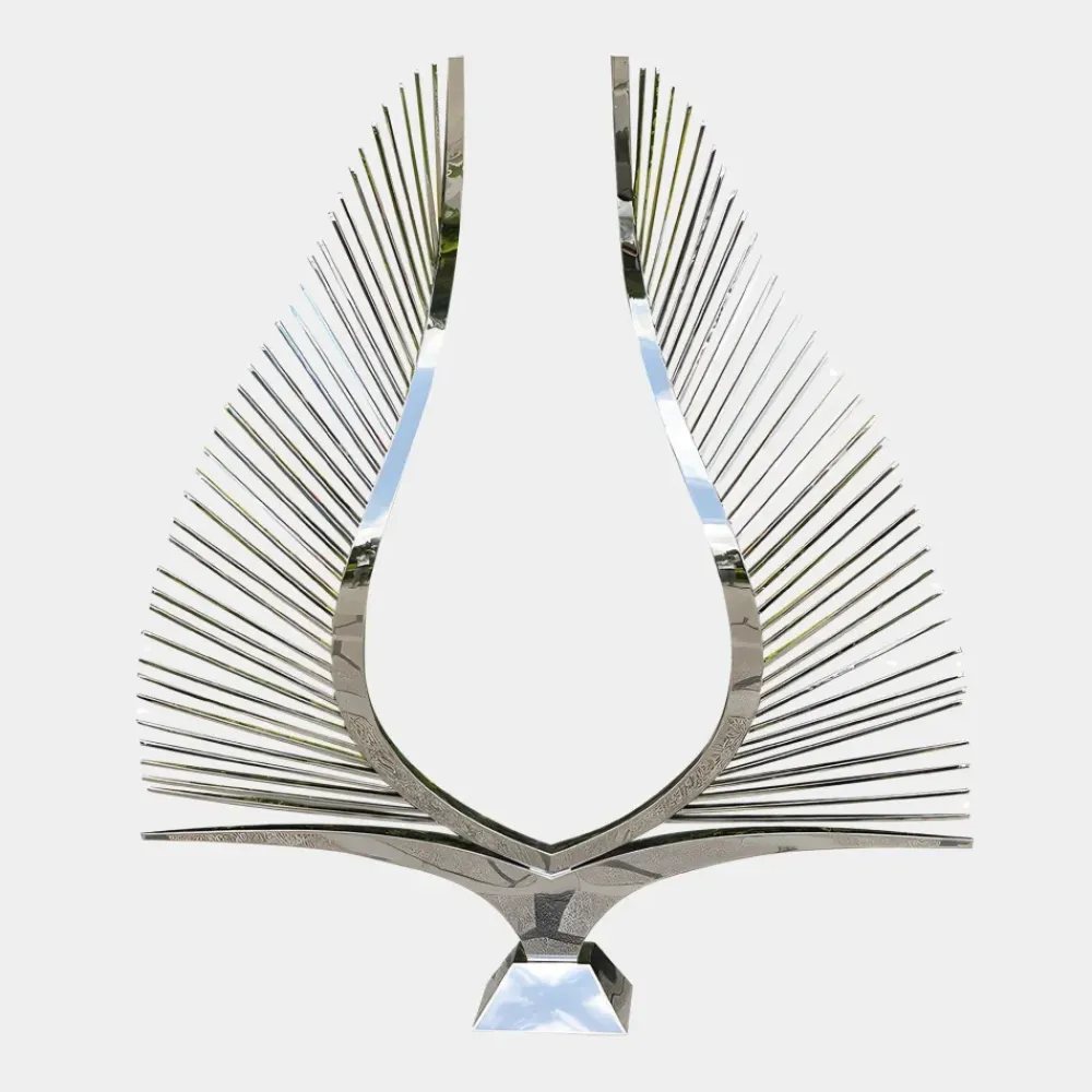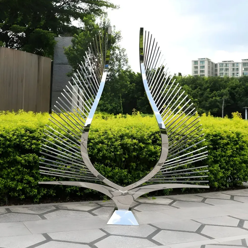 Transform any outdoor space with the Harmonic Wings Sculpture, a captivating blend of modern artistry and celestial symbolism. Crafted from high-quality stainless steel this sculpture features an array of elongated rays extending from a central core representing the radiant energy of the sun and stars. Its polished surface interacts dynamically with natural light reflecting and refracting its surroundings to create an ever-changing visual experience. Designed to be both bold and elegant this piece serves as a striking focal point seamlessly merging contemporary aesthetics with artistic expression.