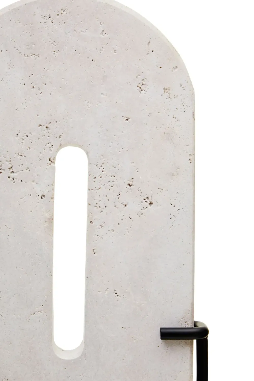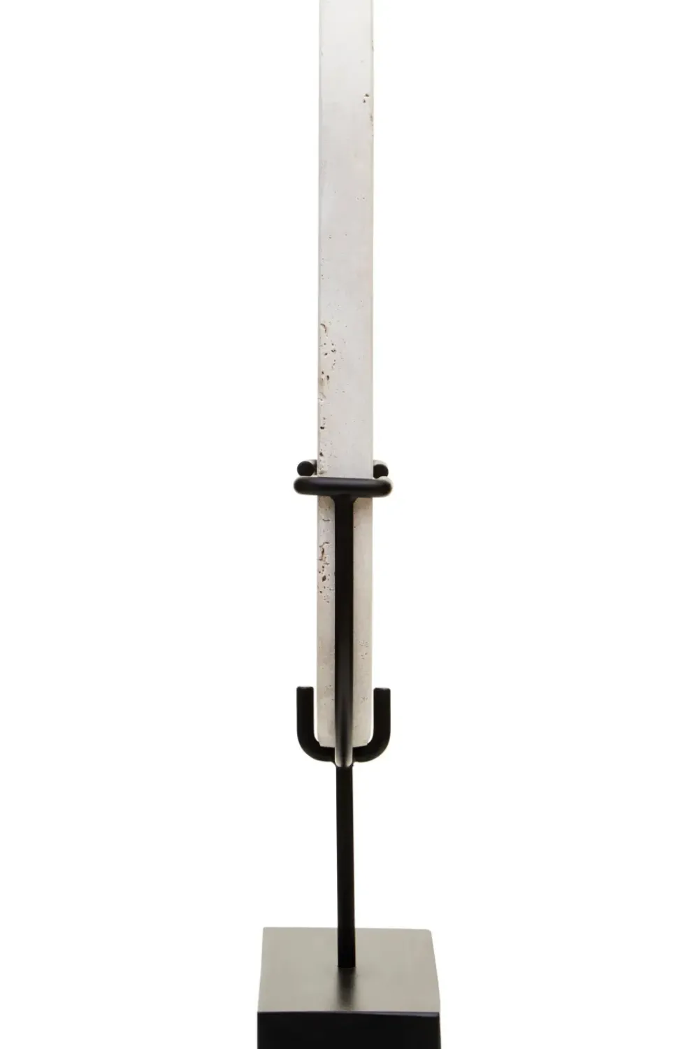 - Material: Natural Travertine Stone Sculpture / Acacia Wood Base / Iron Stem