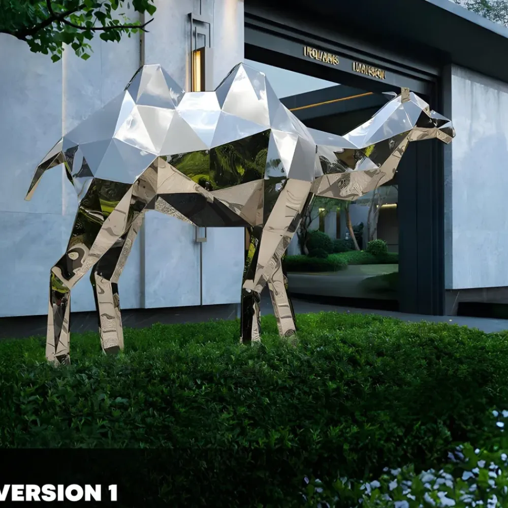 Introducing the Camel Geometric Garden Sculpture: a masterpiece that combines contemporary artistry with meticulous craftsmanship. This design transforms natural elegance into a striking geometric form, with angular facets that reflect light dynamically, creating mesmerising effects that shift with the environment. Constructed from premium stainless steel, its sleek polished finish adds a layer of sophistication making it an eye-catching addition to any space.