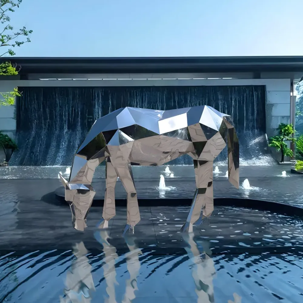 Introducing the Horse Geometric Garden Sculpture: a masterpiece that combines contemporary artistry with meticulous craftsmanship. This design transforms natural elegance into a striking geometric form, with angular facets that reflect light dynamically, creating mesmerising effects that shift with the environment. Constructed from premium stainless steel, its sleek polished finish adds a layer of sophistication making it an eye-catching addition to any space.